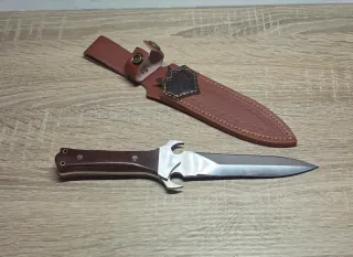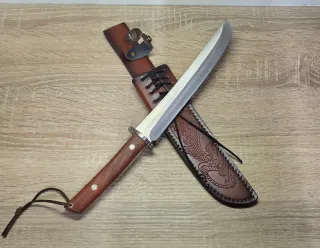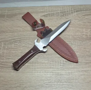 Este cuchillo de colección presenta un diseño robusto y elegante, ideal para coleccionistas. - Hoja de acero pulido. - Mango de madera con incrustaciones. - Funda de cuero marrón con detalles grabados. Se pueden hacer pack más económicos y en un solo envío si se eligen 3 o más cuchillos preguntar sin compromiso, echa un vistazo a todo lo que tengo en mi perfil gracias.