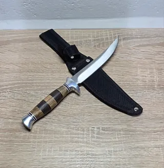Cuchillo de colección con mango de madera y funda. - Hoja de acero inoxidable. - Mango de madera con remaches. - Funda de nylon resistente. Se pueden hacer pack más económicos y en un solo envío si se eligen 3 o más cuchillos preguntar sin compromiso, echa un vistazo a todo lo que tengo en mi perfil gracias.