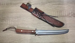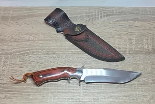Cuchillo de colección con mango de madera y funda de cuero. - Hoja de acero pulido. - Mango de madera con remaches. - Funda de cuero marrón con cierre de botón. Se pueden hacer pack más económicos y en un solo envío si se eligen 3 o más cuchillos preguntar sin compromiso, echa un vistazo a todo lo que tengo en mi perfil gracias.