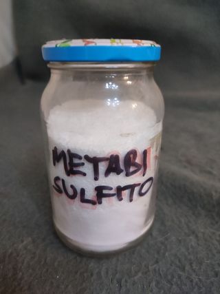 Frasco de metabisulfito de sodio. Es un frasco de cristal con tapa. - Contiene metabisulfito sódico en polvo. - El frasco parece estar casi lleno. - La etiqueta está escrita a mano. Para precipitado de oro disuelto el agua regia. No se los gramos pero da para muchos de oro disuelto en proporción 2 a 1 Reciclage de metales preciosos de dispositivos electronicos