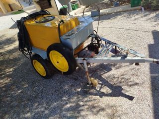 Se vende cuba de fumigar usada. Es de color amarillo y gris, y parece estar en buenas condiciones generales, aunque muestra señales de uso. - Capacidad para fumigar. - Incluye tanque y manguera. - Montada sobre un remolque con ruedas.