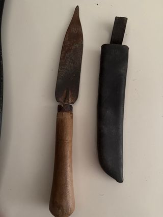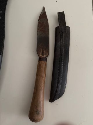 Antigua herramienta de trabajo con mango de madera y funda de cuero. - Hoja de metal con óxido. - Funda de cuero negro con número 30 grabado. - Medidas: 31 cm. (parte metálica 18 cm, mango madera 13 cm.