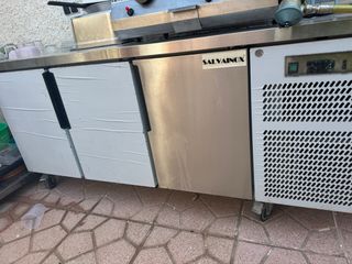 Mesa refrigerada de acero inoxidable con tres puertas, ideal para establecimientos de hostelería. - Construcción robusta en acero inoxidable. - Tres puertas de acceso. - Ruedas para fácil movilidad.