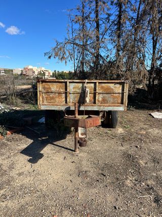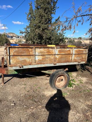Remolque de tractor con un aspecto rústico y desgastado por el tiempo. - Estructura metálica. - Rueda de repuesto. - Enganche para tractor.