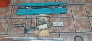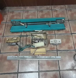 Conjunto de accesorios para máquina de tejer Brother. - Base de tejer. - Caja con accesorios variados. - Piezas metálicas y de plástico.