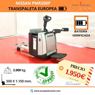 BATERÍA VERIFICADA. Transpaleta eléctrica NISSAN. CAPACIDAD: 2.000 kg. Tamaño de horquilla: 1150 x 550 mm. Respuesta rápida, eficiencia y muy buena maniobrabilidad. Ref: 2114. Modelo: PWR200P. Europa Elevación. ¡Tenemos tu máquina! Llámanos sin compromiso. Disponemos de atención comercial 24 horas. Enviamos a toda España.