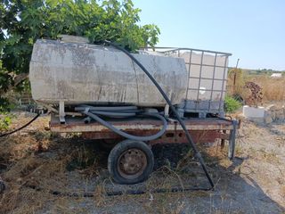 Remolque con dos depósitos para agua. Uno de ellos es de plástico blanco .El otro es una cisterna de 2000l doble pared con aislamiento de 8cn . Con dos aperturas de carga y un grifo de vaciado.