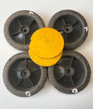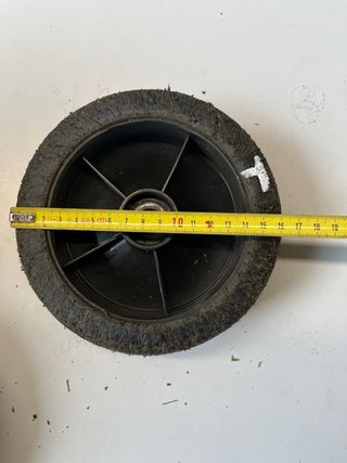 4 ruedas usadas de cortacesped. Tienen todas el mismo tamaño. Sin roturas ni grietas. Diametro del eje/ tornillo de sujeccion: 12mm. Viking, ggp, castelgarden, stiga, desbrozadora, motosierra, stihl, husqvarna