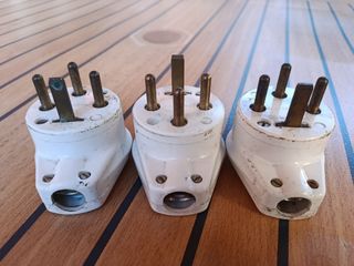 Se venden tres enchufes trifásicos antiguos de la marca Legrand. Son de color blanco en buen estado, aunque muestran señales normales de uso. - Modelo: 20A 380V - Marca: Legrand - Cantidad: 3 unidades