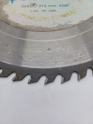 Disco de sierra circular Disco 315 mm. Parece estar en buen estado, aunque presenta algunas marcas de uso. - Diámetro: 315 mm - Diámetro del agujero: 30 mm - Número de dientes: 60