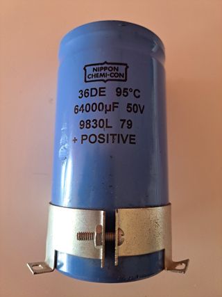 Vendo condensador electrolítico Nippon Chemi-Con. Es un componente electrónico usado, en buen estado. - Capacidad: 64000µF - Voltaje: 50V - Temperatura máxima de funcionamiento: 95°C - Referencia: 36DE 9830L 79