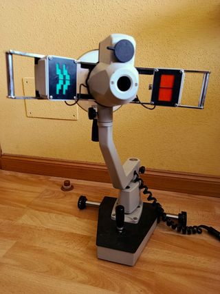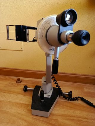 Queratometro de Javal Schiotz fabricado por Sbisa (Florencia - Italia) S.XX. Instrumento profesional oftalmologia optometria para medir curvatura corneal. Muy buen estado de conservacion. Procedente de clinica oftalmologica. Con su transformador. Brazo articulado, base ajustable tipo joystick. Sus mecanismos, luces y palancas funcionan, son manejables y ajustables. Todo parece estar correcto. Sbisá Firenze fue de los mas importantes fabricantes de instrumentos oftalmologicos en Italia. Es sinonimo calidad y precision. Aparato de excelente construccion, muy robusto y pesado. Refractometro optometrista oftalmologo astigmatismo