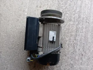 Motor eléctrico trifásico de la marca Soga. Cuenta con una polea en la parte superior y una caja de conexiones en el lateral. - Carcasa de aluminio. - Montaje con brida. - Cableado expuesto en la conexión.