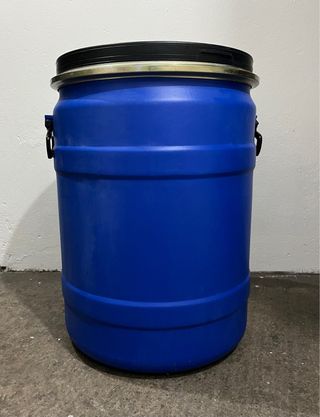 Bidón de plástico hermético con cierre metálico, ideal para almacenamiento. - Medidas: 48cm diámetro x 69,5cm de alto. - Capacidad de 120 litros. - Cierre hermético de metal.
