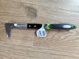 Herramienta de jardinería Ribimex. - Hoja de acero inoxidable resistente y duradera. - Diseño en forma de "L" para una limpieza eficaz en rincones de difícil acceso. - Mango ergonómico Soft Touch para un agarre cómodo y seguro. PVP: 14€