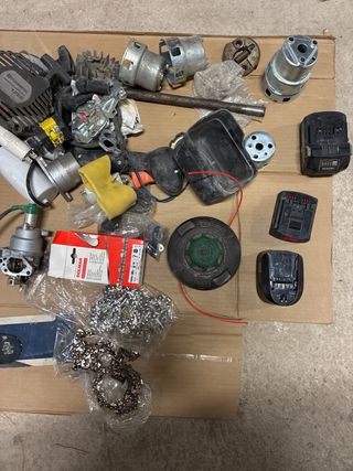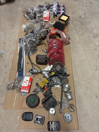 Recambio para máquinas de jardinería, tanto nuevos como de segunda mano. Ideal para reparaciones o mantenimiento. - piezas para desbrozadoras, motosierras y otras herramientas. - Variedad de filtros, carburadores y componentes. - Cadenas y espadas para motosierra. - Baterías y cargadores. cadenas de motosierra de varias medidas carburadores filtros de aire nuevos en su caja 1 mando y embrague de desbrozadora 4 bobinas 1 espada motosierra cabezal desbrozadora 3 baterías 1 disco de radial grande de diamante, etc....