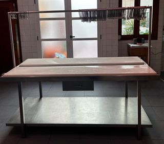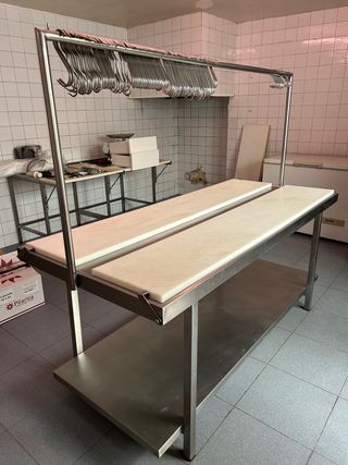 Mesa de trabajo profesional de acero inoxidable, ideal para carnicerías u otros negocios. En muy buen estado. Medidas: - Alto: 90cm. - Ancho: 90cm. - Largo: 200cm. Recogida en Turís (Valencia). No leer: carnicería, carne, cocina.