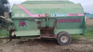 Carro mezclador Tatoma modelo MT-10 unifeed en buen estado. Se vende por cese de actividad. Está funcionando al día, no hay que hacerle nada. Cinta/banda y cuchillas en buen estado. Funcionando todo perfectamente. Lombarte, solomix, amazone, John Deere, new Holland, ebro, - Color verde. - Diseño con toro rosa. - Logo Unifeed.
