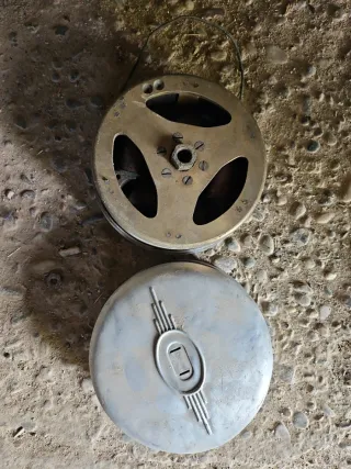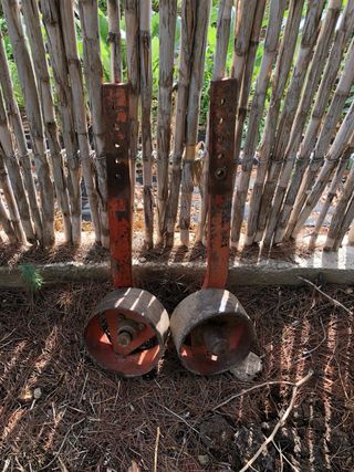 Se venden piezas de cultivador antiguo, ideales para coleccionistas o para restaurar maquinaria agrícola. - Incluye dos ruedas metálicas con soporte. - Estructura de metal con pintura naranja desgastada. - Presenta signos de óxido y uso.