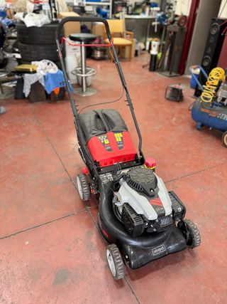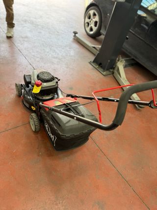 Corta césped de gasolina marca Scheppach. - Motor de 99cc. - Chasis negro y detalles en rojo y gris. - Ruedas delanteras y traseras. No se envia, recogida en persona.