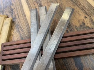 CUATRO JUEGOS de CUATRO cuchillas de 275*23*3mm. UN JUEGO con placa de WIDEA, especial para el cepillado de maderas muy duras, aglomerados. Placa soldada de metal duro afilable y DOS JUEGOS de acero HSS envueltos en papel y afilados.