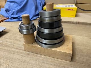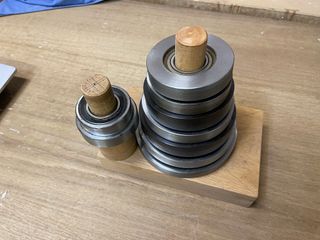 Cojinetes para el fresado en tupi de 30 a tope eje, de diámetros en mm de: 52--72--86--90--100--110--120--130 y 140 mm., en base soporte de madera torneado y soporte menor para la comprobación del montaje.