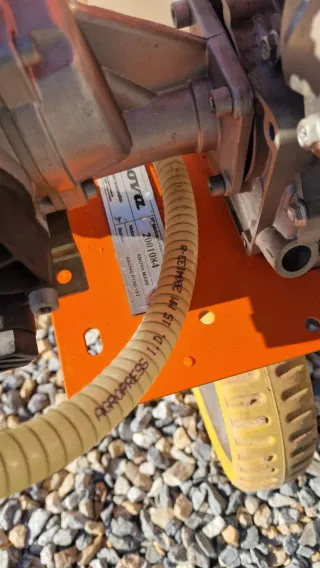 Pulverizador portátil con motor de gasolina, ideal para diversas aplicaciones. - Motor de gasolina rojo. - Mangueras de conexión naranja y amarilla. - Estructura metálica negra.