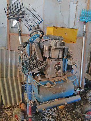 Compresor Zanon de 1250L/minuto cargaba un deposito de 1000L pero pesava mucho y se adaptó uno de 50L (ahun tengo los calderines - ver perfil). Apto para 3-4 aplausos de olivas con motor a ralenti. No mareantes. Herramientas en el perfil. oliva aceituna aplausos vareadores neumaticos campagnola aire comprimido poda cosecha maquina
