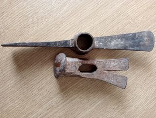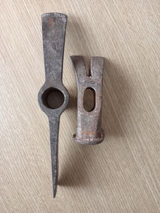 Se venden un martillo(12,5*5,5) y una alcotana (26,5) antiguos. Ambos parecen estar usados, con señales de desgaste por el tiempo. - Piezas de metal. - Ideales para coleccionistas. Se pueden vender a 5€ separados.