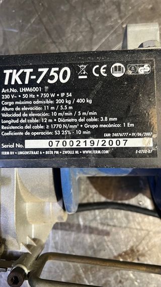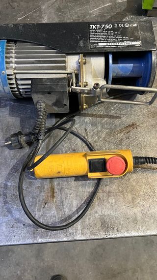 Polipasto eléctrico TKT-750 con mando a distancia. - Capacidad de carga: 400 kg. - Potencia: 750 W. - Altura de elevación: 12 m. - Velocidad de elevación: 5 m/min.