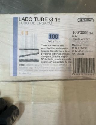 Tubos de ensayo de plástico, ideales para servir cócteles o especias. TENGO DOS CAJAS - CADA UNA 20€ - Sin tapón. - Material: vidrio.
