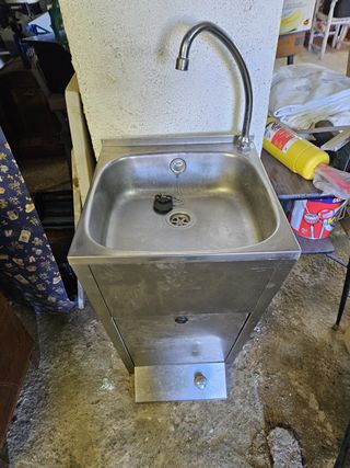 Lavamanos de acero inoxidable, ideal para entornos industriales o comerciales. Su diseño robusto y material resistente lo hacen una opción duradera. - Fabricado en acero inoxidable. - Grifo curvo de metal. - Incluye tapón y cadena para el desagüe. - Pedal para accionamiento del agua.