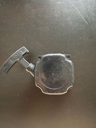 Tirador de arranque para desbrozadora. - Carcasa de plástico negro. - Mecanismo de polea blanco.
