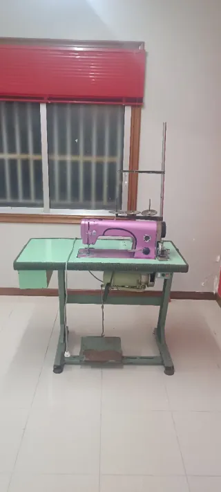 Máquina de coser industrial Refrey en color rosa. - Estructura metálica. - Incluye pedal. - Soporte para hilos.
