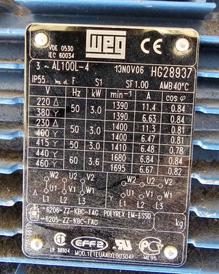 Vendo motor eléctrico industrial trifásico WEG en muy buen estado visual (carcasa robusta, pintado azul), ideal para bombas, compresores, ventilación, maquinaria de taller, cintas, etc. Lleva caja de bornes superior y en la placa trae el esquema de conexión estrella/triángulo. Datos de placa: Marca / modelo: WEG AL100L-4 (3~) Potencia: 3,0 kW a 50 Hz (3,6 kW a 60 Hz) Velocidad: 1390–1410 rpm (50 Hz) / 1680–1695 rpm (60 Hz) Tensiones: 230V Δ / 400V Y (también 220Δ/380Y y 415Y) Protección: IP55 Servicio: S1 (continuo) – Clase de aislamiento F – SF 1.00 – AMB 40oC - Potencia: 3 kW (4CV) - Tipo: Trifásico Se entrega tal cual aparece