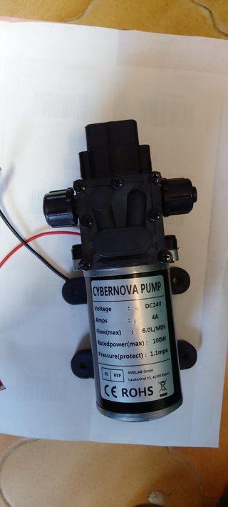 Bomba de agua CYBERNOVA de alta presión. - Voltaje: DC24V - Amperaje: 4A - Caudal máximo: 6.0L/MIN - Potencia máxima: 100W - Presión de protección: 1.1mpa