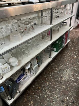 Estantería de contrabarra para bar o negocio. Fabricada en acero inoxidable, es robusta y funcional. - Medidas: 245 cm (largo) x 115 cm (alto) x 30 cm (profundidad). - Estructura de acero inoxidable. - Múltiples baldas para almacenamiento.