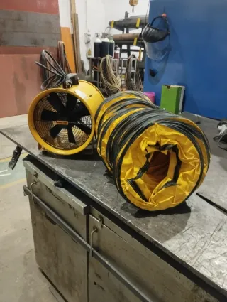 Extractor de aire industrial de color amarillo, ideal para ventilación en espacios de trabajo. - Diámetro del ventilador: 12 pulgadas. - Manguera flexible de 15 pies. - Motor potente para un flujo de aire eficiente.