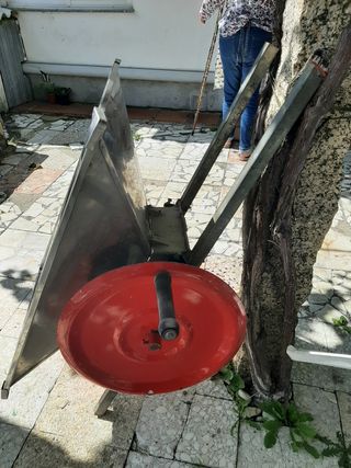 Antigua estrujadora manual de uvas. Ideal para la elaboración artesanal de vino. - Estructura de madera y metal. - Mecanismo de manivela. - En buen estado de conservación, con señales de uso. - Se incluye una tolva de madera roja. Se encuentra en Moreira, A Devesa, número 10. teléfono de contacto: 986571970