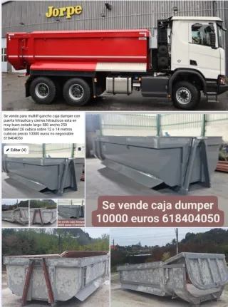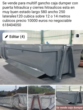 Caja dumper para multilif gancho con puerta y cierres hidráulicos. - Largo: 5.80 metros - Ancho: 2.50 metros - Laterales: 1.20 metros - Capacidad: 12-14 metros cúbicos - Precio: 10000 euros (no negociable) - Teléfono: 618404050