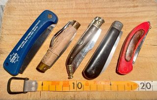 Conjunto de cinco navajas de bolsillo con diferentes diseños y mangos.