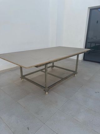 Mesa de trabajo robusta fabricada en acero inoxidable, ideal para cocinas o talleres. - Superficie lisa y fácil de limpiar. - Incluye un cajón para almacenamiento. - Estructura metálica resistente. - Base con balda inferior. - Ruedas para facilitar el desplazamiento.