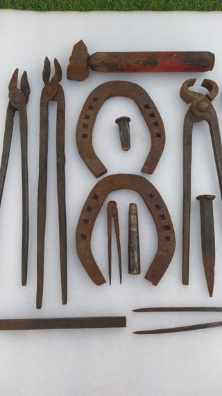 Juego de herramientas antiguas de herrero. Ideales para coleccionistas o entusiastas de la forja. También para hacer herraduras. - Incluye 2 herraduras viejas, 2 tenazas, 1 martillo, 2 punzones, 2 compases y varias piezas más. - Las herramientas muestran señales de uso y desgaste, propias del paso del tiempo. - Se venden tal cual se ven en las fotos.