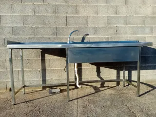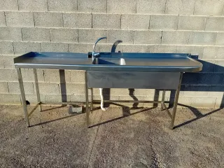 Fregadero de gran tamaño con una superficie de trabajo amplia y un grifo.midida 2,20cm de largo, 56cm de ancho, 85cm ast suelo - Fabricado en metal. - Color plateado y gris.