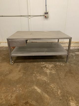 Mesa de trabajo de acero inoxidable con balda y dos cajones. Ideal para hostelería o talleres. - Medidas: 196 x 146 x 90 cm (alto). - Precio: 500€.