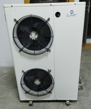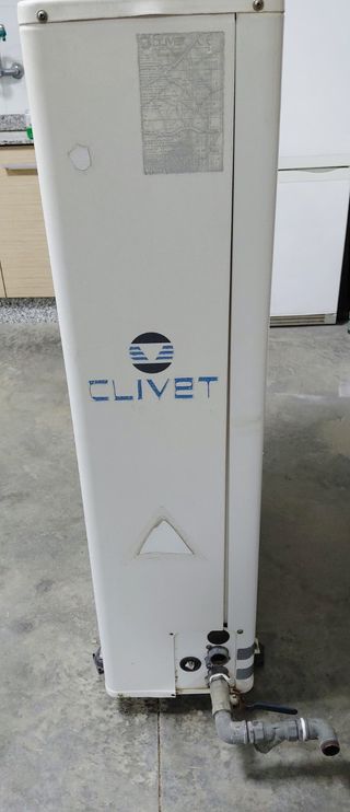Enfriadora de aerotermia de la marca Clivet. Vendo enfriadora de aerotermia Clivet (bomba de calor aire-agua) de gran capacidad, con dos ventiladores frontales. Sirve para calefacción y refrigeración en suelo radiante, fan-coils o climatización hidrónica. La unidad ARRANCA correctamente. Incluye mando original. No sabemos cuál es el fallo exacto o si lo tiene, nunca pudimos poner la temperatura ideaal en casa, es posible que no haya sido bien instalada, por eso se vende como unidad para revisar o poner a punto. - Unidad en buen estado. - Diseño vertical.