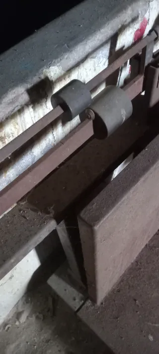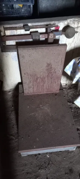 Báscula de pesaje antigua con una robusta plancha. - Estructura metálica. - Mecanismo de pesaje visible. - Plancha de gran tamaño.