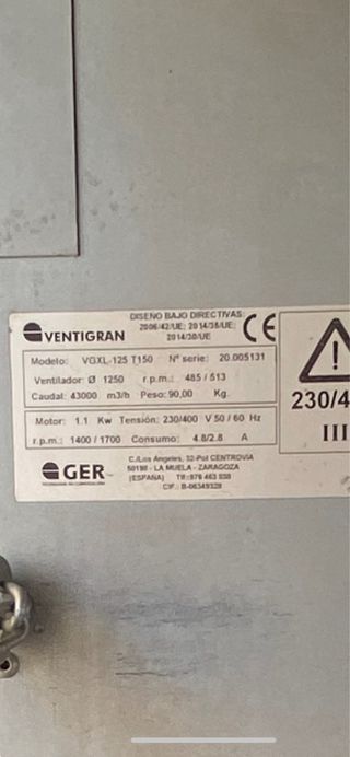 Vendo extractores industriales Ventigran VGXL-125 T150, diámetro 1,25 m, con persianas automáticas y motor de 1,1 kW. Ofrecen un caudal de 43.000 m³/h, ideales para invernaderos, granjas, naves industriales o almacenes. Solo han trabajado unas 40 horas reales, exclusivamente durante un verano. Estado prácticamente nuevo: motor, correas, persianas y estructura en perfectas condiciones. Características técnicas: • Diámetro: 1.250 mm • Caudal: 43.000 m³/h • Motor: 1,1 kW – 230/400 V • Revoluciones: 1.400 / 1.700 rpm • Persianas automáticas • Carcasa metálica reforzada • Peso: 90 kg Precio por unidad: 1.150 € (Se puede negociar si se llevan varias unidades.)