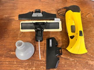 Conjunto de accesorios para limpieza Karcher. - Cabezal de limpieza con paño. - Botella pulverizadora. - Accesorio de goma. - Unidad principal amarilla.