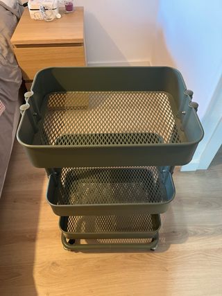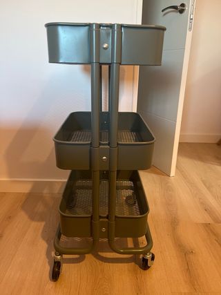 Práctico carro metálico de tres niveles. Su diseño permite organizar y almacenar diversos objetos de forma ordenada. - Color verde oscuro. - Estructura de metal. - Ruedas para fácil movilidad.
